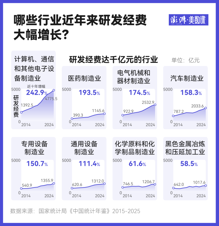 在这之中,计较机、通讯和其他电子竖立制造业、医药制造业以及电气机械和器材制造业这3个行业,是2014年到2024年研发经费干预增长最快的行业,其中仅计较机、通讯和其他电子竖立制造业在畴前一年就干预了4775.5亿元研发经费。