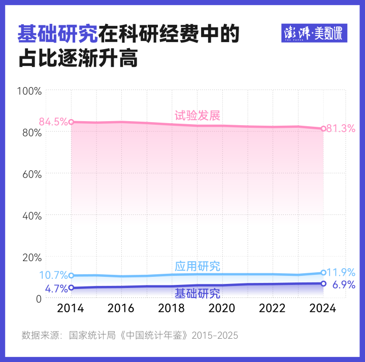 2024年,宇宙基础洽商、哄骗洽商和查验发展经费开销占比分离为6.9%、11.0%和82.2%。所谓的基础洽商,是指不预设任何特定哄骗或使用主见的实验性或表面性使命,哄骗洽商则是探索基础洽商恶果的可能用途,而查验发展则是为开拓新的家具、工艺或纠正现存家具、工艺而作念的系统性洽商。