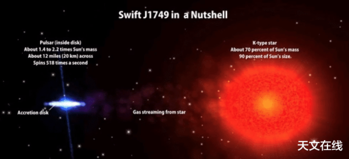 天体裁家们所扣问的是PSR J1023+0038(J1023)脉冲星,它坐落于距地球4500光年以外的一个双星系统中。这个双星系统包含一颗“死星”,即一颗每秒自转600周的中子星,以及一颗小质料恒星,动作中子星的“补给”。