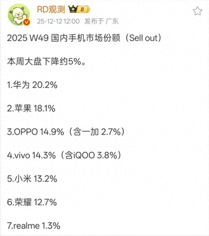 把柄 RD 不雅测的最新数据,在第 48 和 49 周,华为国内阛阓份额胜利冲到了 20.2%,稳坐第一。