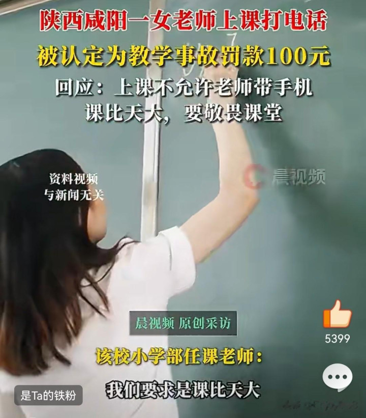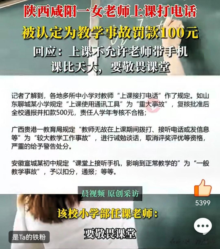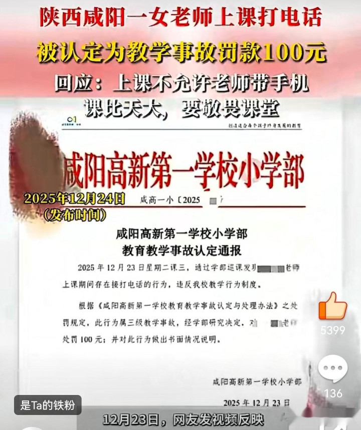 一次上课时的电话接听,让陕西咸阳的一位小学忠实被寻查东说念主员发现,随后她被学校认定为三级教学事故,靠近罚金100元的处罚。